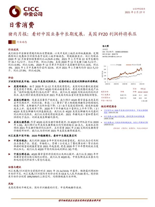 【中金公司】【20210227】猪肉月报:看好中国业务中长期发展,美国FY20利润料将承压-16页 行业研究