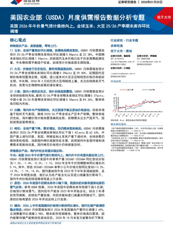 【国信证券】【202601】美国农业部(USDA)月度供需报告数据分析专题:美国2026年牛价景气预计维持向上,全球玉米、大豆25/26产季期末库存环比调增-37页 证券期货研究报告