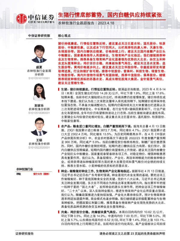 【中信证券】【20230418】农林牧渔行业跟踪报告:生猪行情底部蓄势,国内白糖供应持续紧张-24页 行业研究
