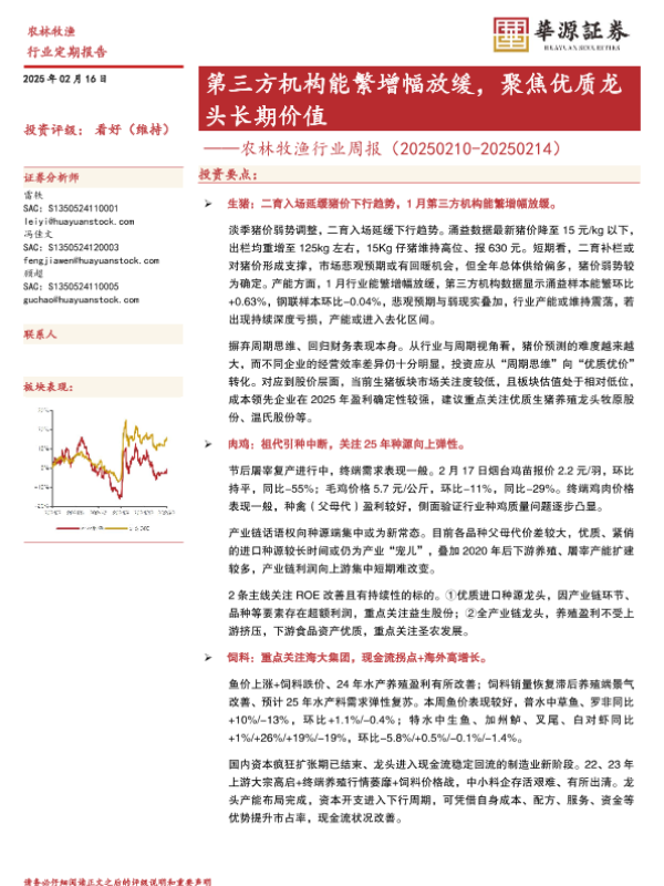 【华源证券】【20250216】农林牧渔行业周报:第三方机构能繁增幅放缓,聚焦优质龙头长期价值-16页 行业研究