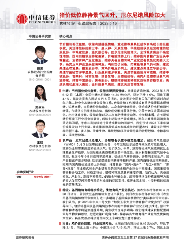 【中信证券】【20230516】农林牧渔行业跟踪报告:猪价低位静待景气回升,厄尔尼诺风险加大-28页 行业研究