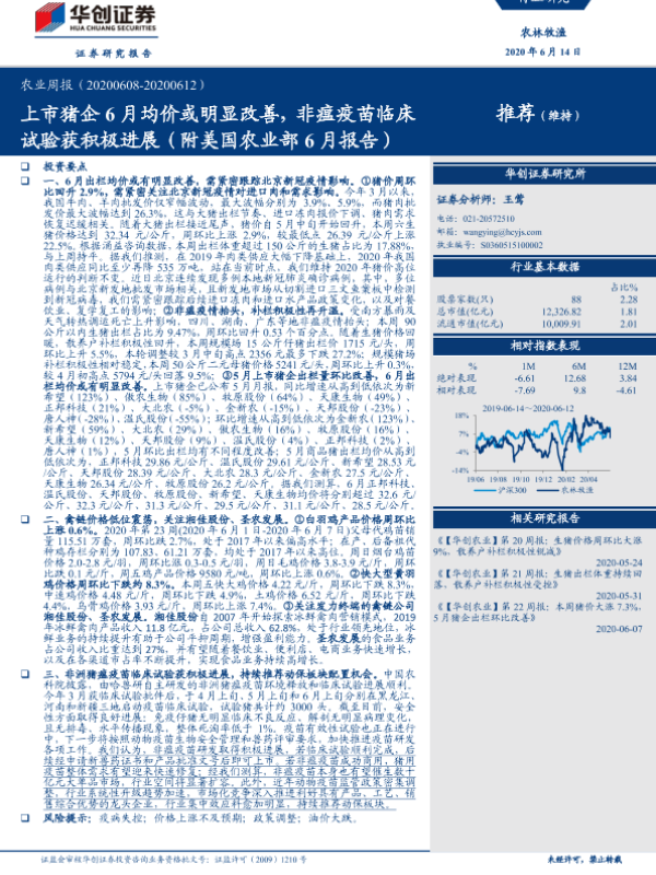 【华创证券】【20200614】20200614-华创证券-农业周报:上市猪企6月均价或明显改善,非瘟疫苗临床试验获积极进展(附美国农业部6月报告)-53页 行业研究