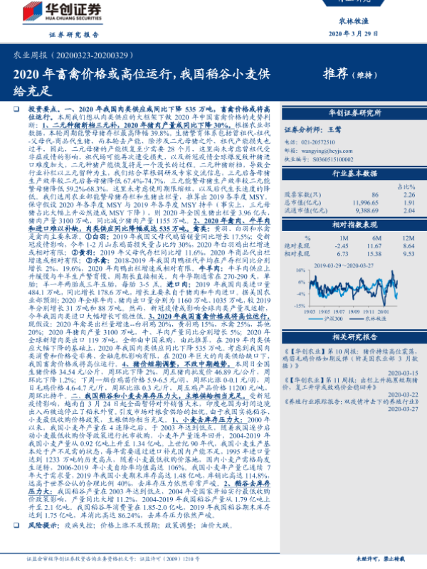 【华创证券】【20200329】20200329-华创证券-农业周报:2020年畜禽价格或高位运行,我国稻谷小麦供给充足-44页 行业研究