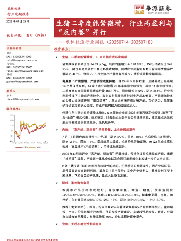 【华源证券】【20250721】农林牧渔行业周报:生猪二季度能繁微增,行业高盈利与“反内卷”并行-16页 行业研究