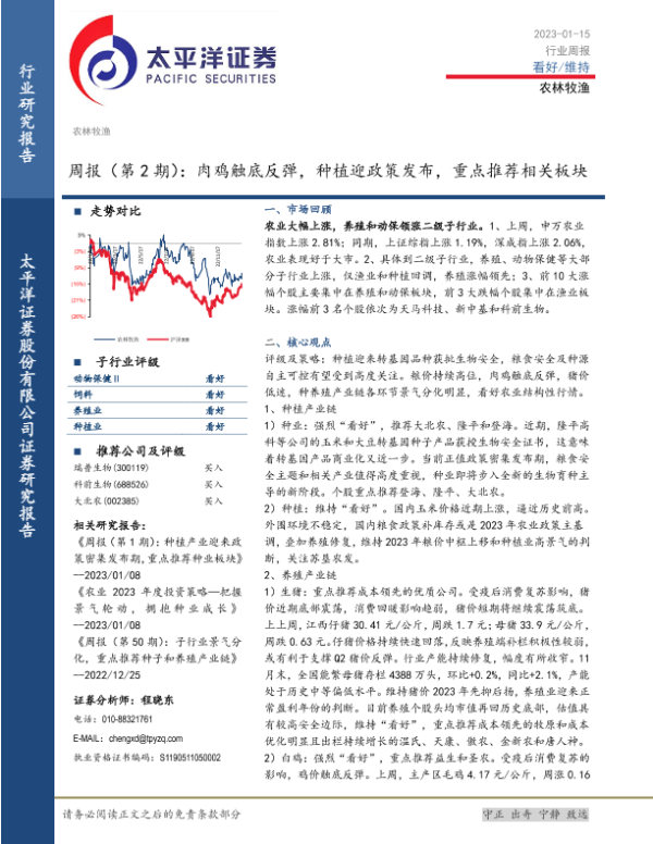 【太平洋证券】【20230115】20230115-太平洋-农林牧渔周报(第2期):肉鸡触底反弹,种植迎政策发布,重点推荐相关板块-16页 行业研究