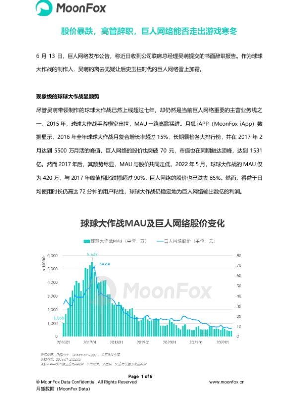 【月狐数据(MoonFox Data)】【202206】股价暴跌,高管辞职,巨人网络能否走出游戏寒冬-6页 行业研究