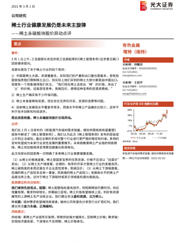 【光大证券】【20210301】稀土永磁板块股价异动点评:稀土行业健康发展仍是未来主旋律-2页 行业研究