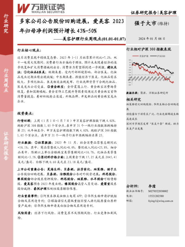 【万联证券】【20240108】多家公司公告股份回购进展,爱美客2023年归母净利润预计增长43%-50%-11页 行业研究