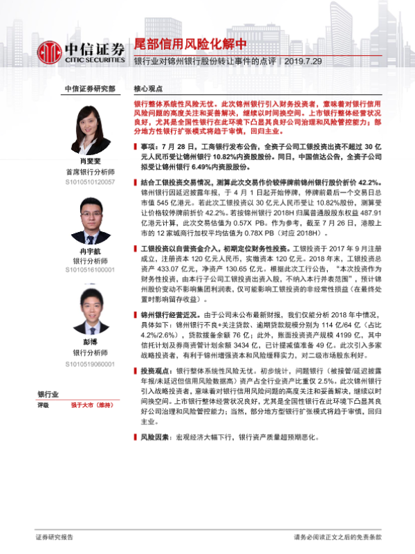 【中信证券】【20190729】银行业对锦州银行股份转让事件的点评:尾部信用风险化解中-2页 行业研究