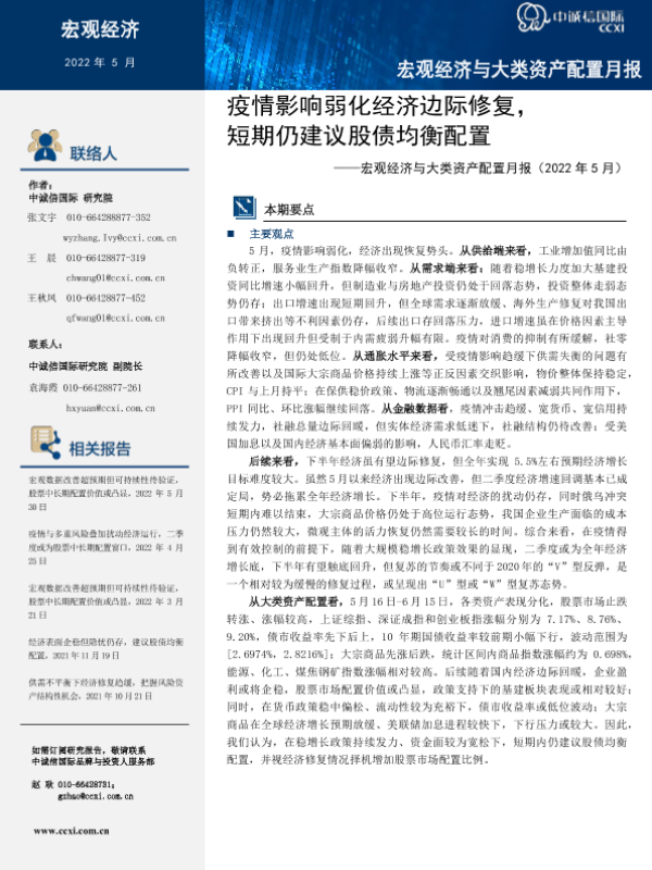【中诚信国际】【20220531】宏观经济与大类资产配置月报(2022年5月):疫情影响弱化经济边际修复,短期仍建议股债均衡配置-16页 行业研究