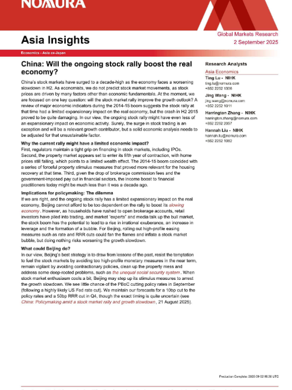 【NOMURA】【20250902】China Will the ongoing stock rally boost the real economy?-10页 证券期货研究报告