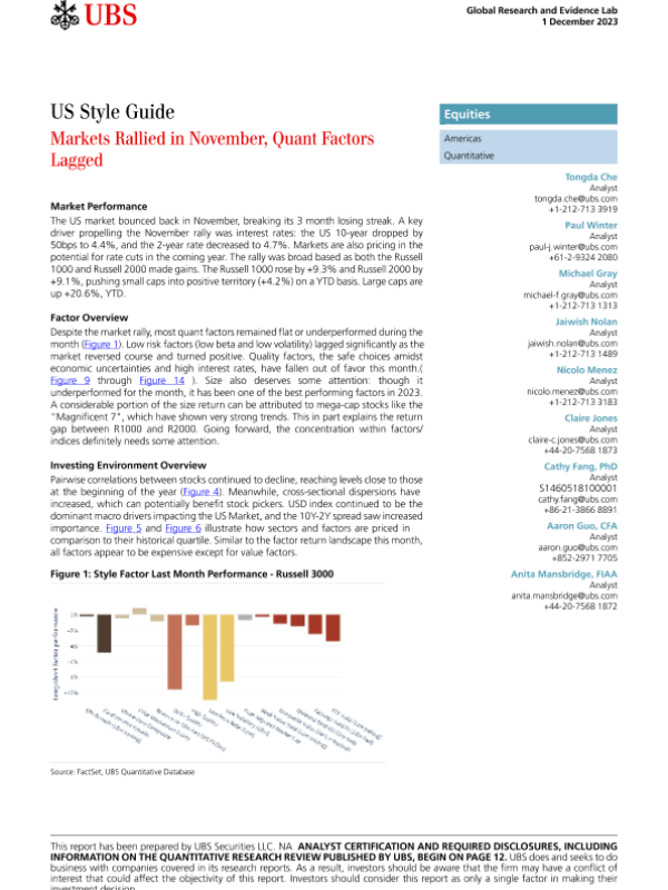 【UBS Securities LLC】【20231201】US Style Guide Markets Rallied in November, Quant Factors Lagged-16页 行业研究