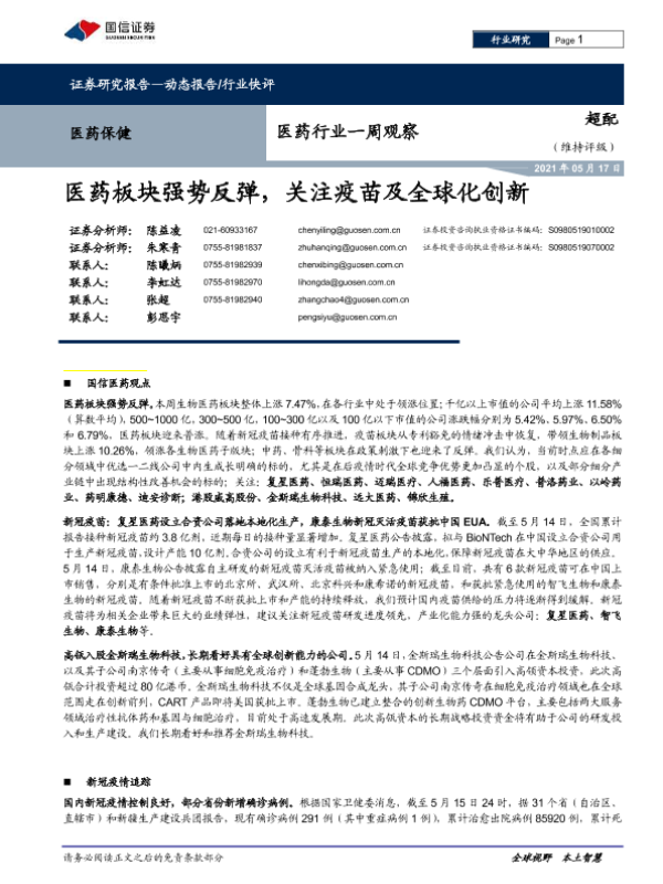 【国信证券】【20210517】医药行业一周观察:医药板块强势反弹,关注疫苗及全球化创新-11页 行业研究
