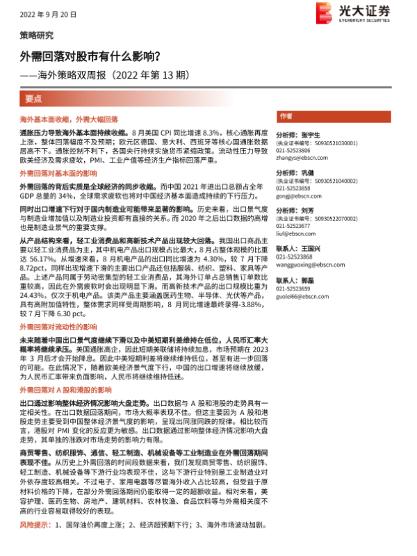 【光大证券】【20220920】海外策略双周报(2022年第13期):外需回落对股市有什么影响?-18页 行业研究