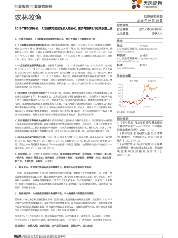 【天风证券】【20190728】农林牧渔2019年第30周周报:7月能繁母猪或继续大幅去化,猪价有望在8月继续快速上涨-14页 行业研究