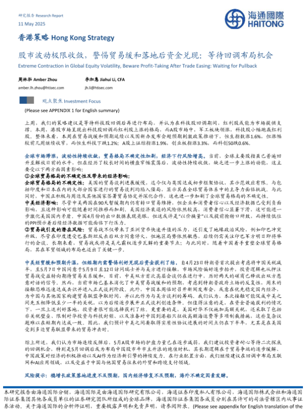 【海通国际】【20250511】香港策略:股市波动极限收敛,警惕贸易缓和落地后资金兑现,等待回调布局机会-10页 宏观策略
