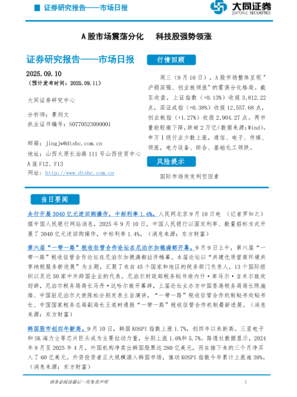 【大同证券】【202509】A股市场震荡分化 科技股强势领涨-250910-5页 证券期货研究报告