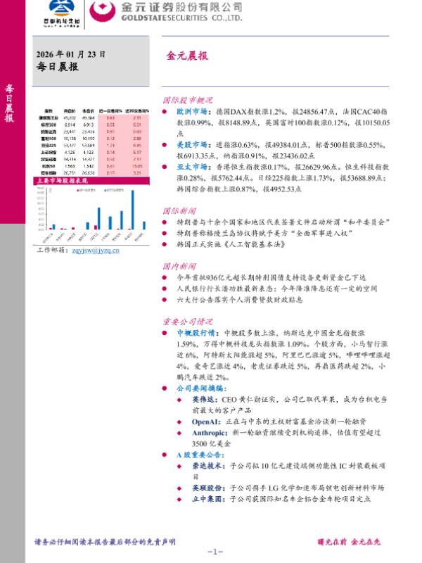 【金元证券】【202601】2026年 01月 23日每日晨报-6页 证券期货研究报告