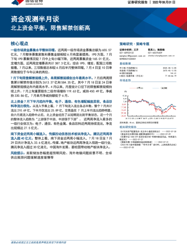 【国信证券】【20220801】资金观测半月谈:北上资金平衡,限售解禁创新高-19页 行业研究