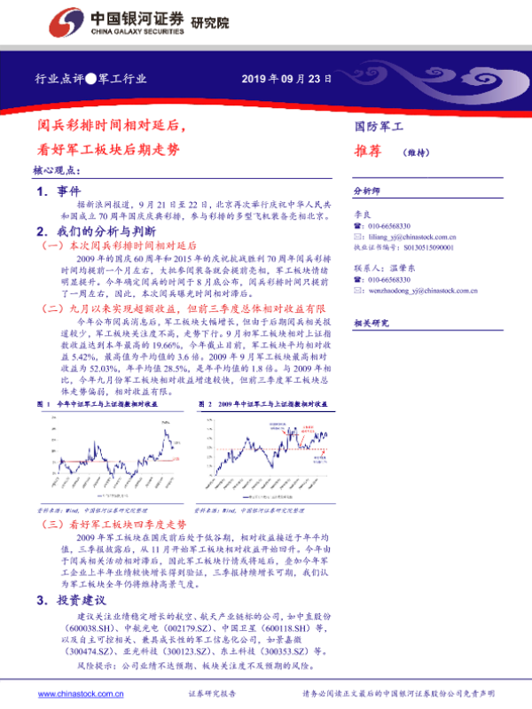 【银河证券】【20190923】军工行业:阅兵彩排时间相对延后,看好军工板块后期走势-3页 行业研究