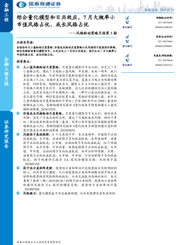 【国泰海通证券】【20250702】风格轮动策略月报第3期:综合量化模型和日历效应,7月大概率小市值风格占优、成长风格占优-17页 证券期货研究报告