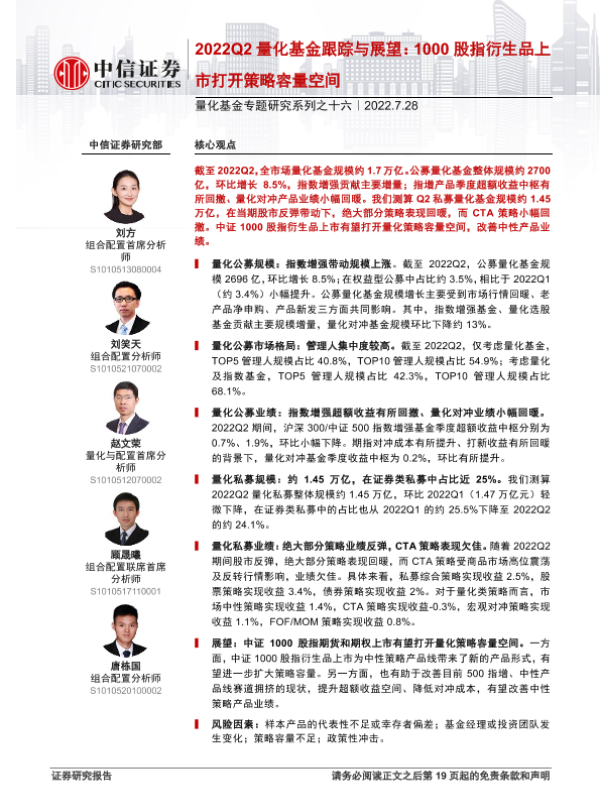 【中信证券】【20220728】量化基金专题研究系列之十六:2022Q2量化基金跟踪与展望,1000股指衍生品上市打开策略容量空间-20页 行业研究