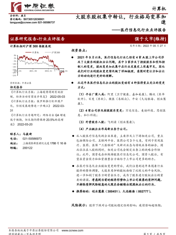 【中原证券】【20220527】医疗信息化行业点评报告:大股东股权集中转让,行业格局变革加速-5页 行业研究