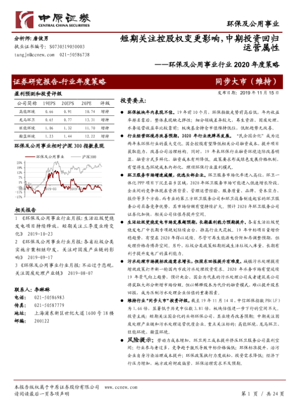 【中原证券】【20191115】环保及公用事业行业2020年度策略-24页 行业研究
