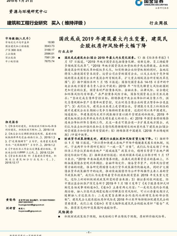 【国金证券】【20190121】建筑和工程行业研究周报:国改或成2019年建筑最大内生变量,建筑民企股权质押风险料大幅下降-14页 行业研究