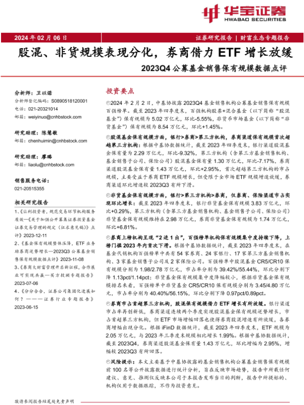 【华宝证券】【20240206】2023Q4公募基金销售保有规模数据点评:股混、非货规模表现分化,券商借力ETF增长放缓-13页 行业研究