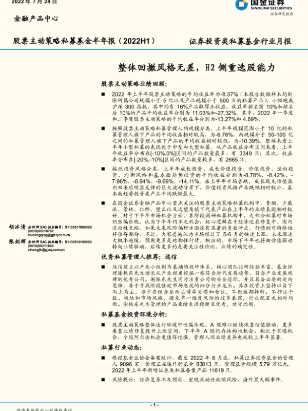 【国金证券】【20220724】股票主动策略私募基金半年报(2022H1):整体回撤风格无差,H2侧重选股能力-17页 行业研究