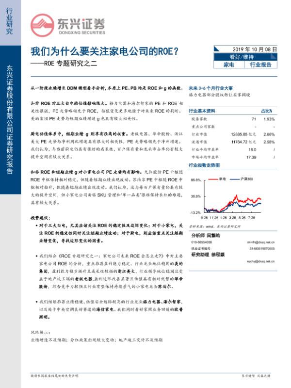 【东兴证券】【20191008】家电ROE专题研究之二:我们为什么要关注家电公司的ROE?-8页 行业研究