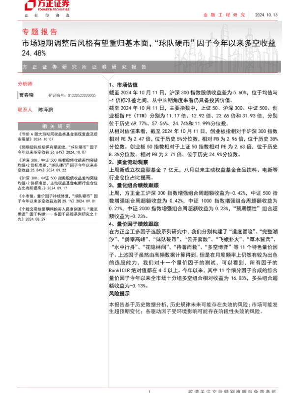 【方正证券】【20241013】专题报告:市场短期调整后风格有望重归基本面,“球队硬币”因子今年以来多空收益24.48%-15页 行业研究