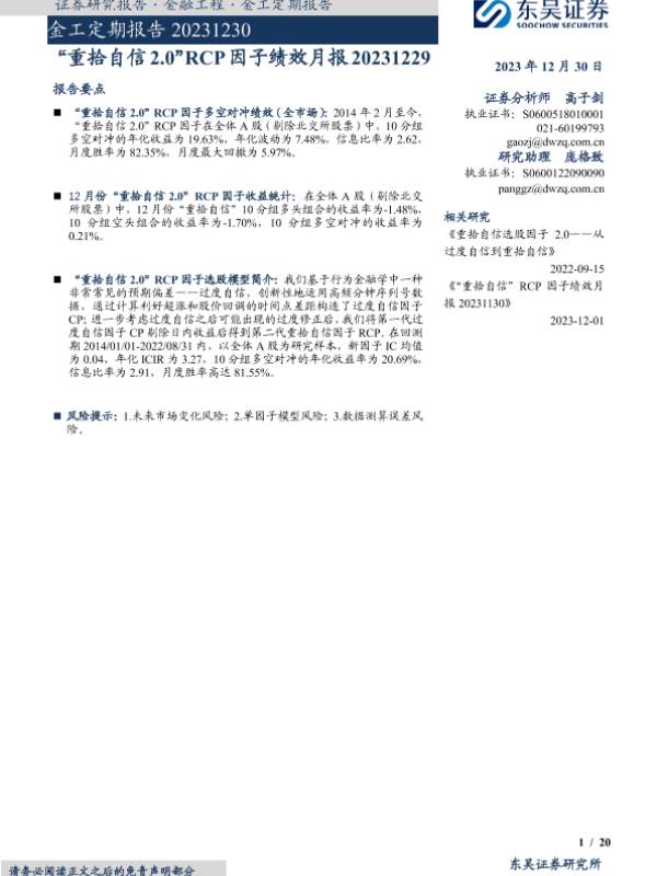 【东吴证券】【20231230】金工定期报告:“重拾自信2.0”RCP因子绩效月报-20页 行业研究