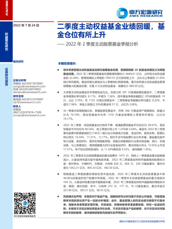 【申万宏源】【20220724】2022年2季度主动股票基金季报分析:二季度主动权益基金业绩回暖,基金仓位有所上升-19页 行业研究