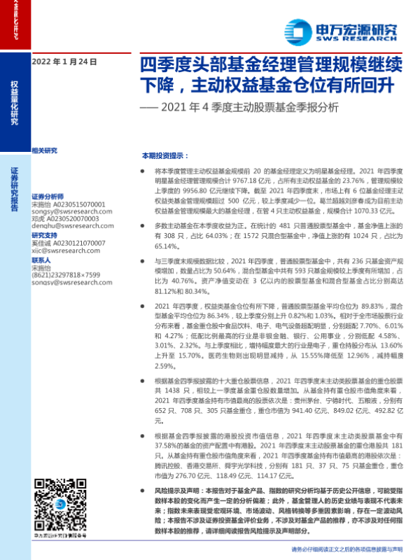 【申万宏源】【20220124】2021年4季度主动股票基金季报分析:四季度头部基金经理管理规模继续下降,主动权益基金仓位有所回升-19页 行业研究