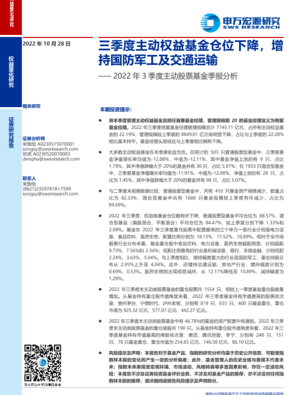 【申万宏源】【20221028】2022年3季度主动股票基金季报分析:三季度主动权益基金仓位下降,增持国防军工及交通运输-19页 行业研究