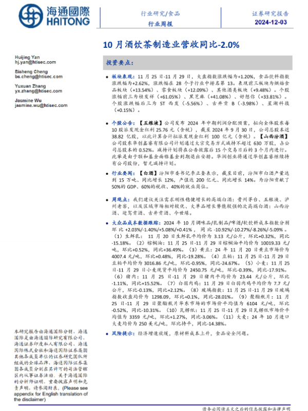 【海通国际】【20241203】20241203-海通国际-食品行业周报:10月酒饮茶制造业营收同比-2.0%-22页 行业研究