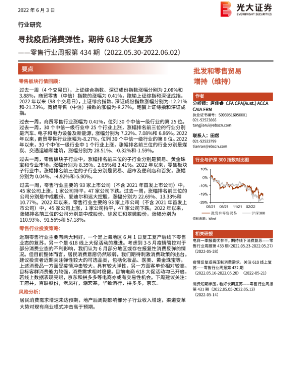 【光大证券】【20220603】零售行业周报第434期:寻找疫后消费弹性,期待618大促复苏-8页 行业研究