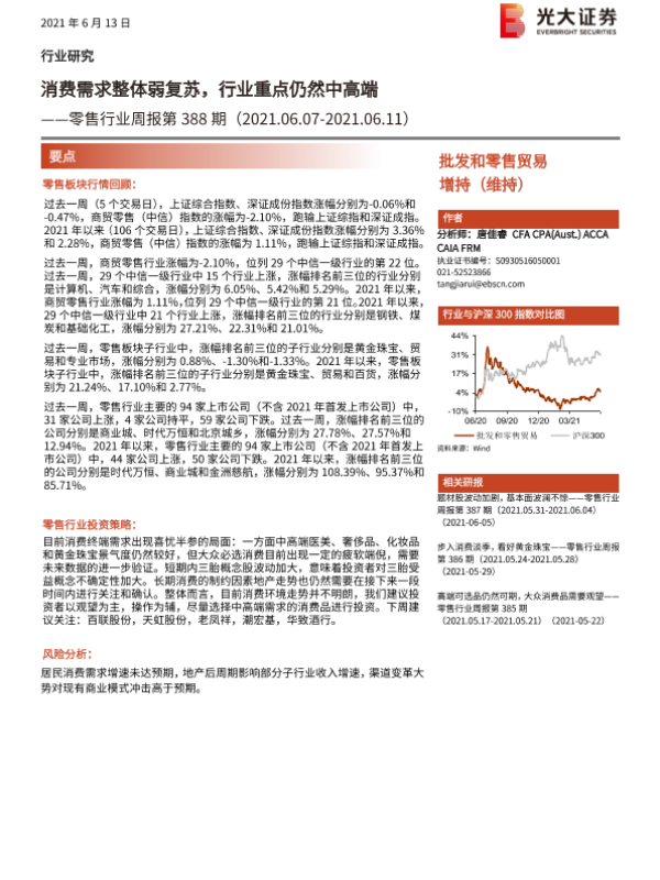 【光大证券】【20210613】零售行业周报第388期:消费需求整体弱复苏,行业重点仍然中高端-9页 行业研究