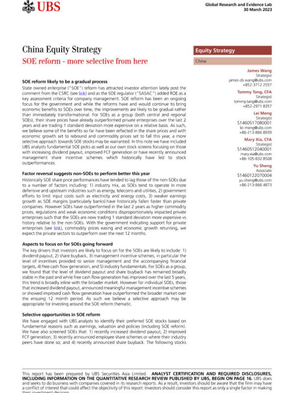 【UBS Securities Asia Limited】【20230330】中国股权策略:国企改革——从此更加精选...-22页 行业研究