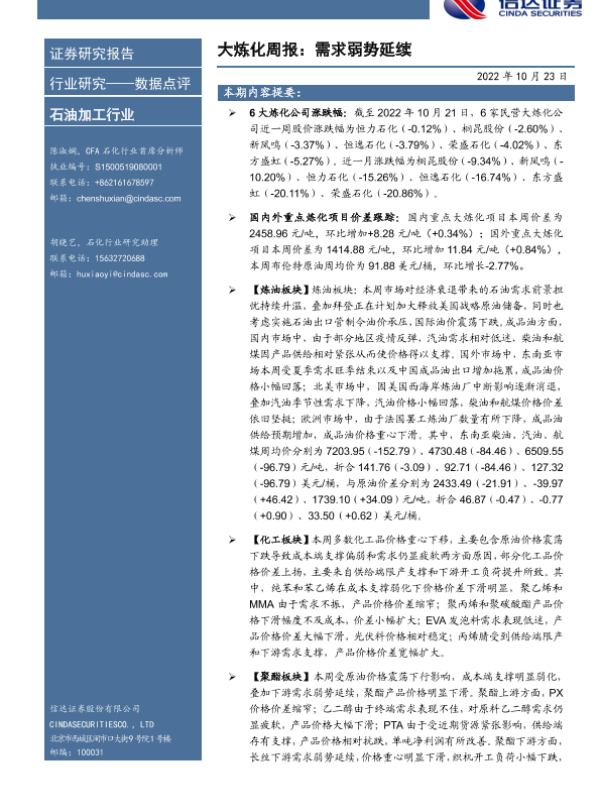 【信达证券】【20221023】石油加工行业大炼化周报:需求弱势延续-20页 行业研究