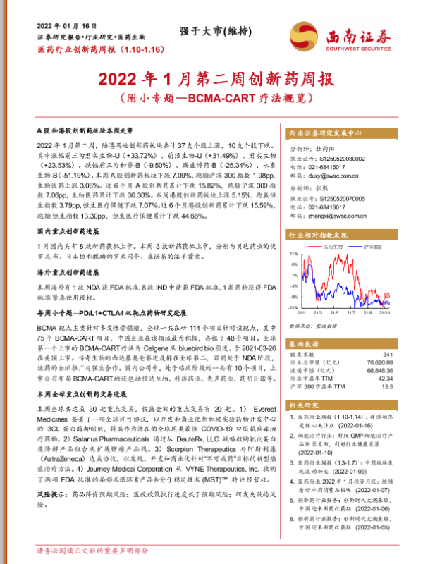 【西南证券】【20220116】2022年1月第二周创新药周报-30页 行业研究