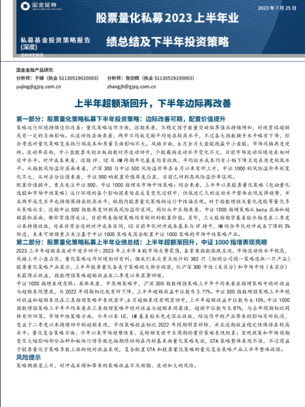 【国金证券】【20230725】股票量化私募2023上半年业绩总结及下半年投资策略-19页 行业研究