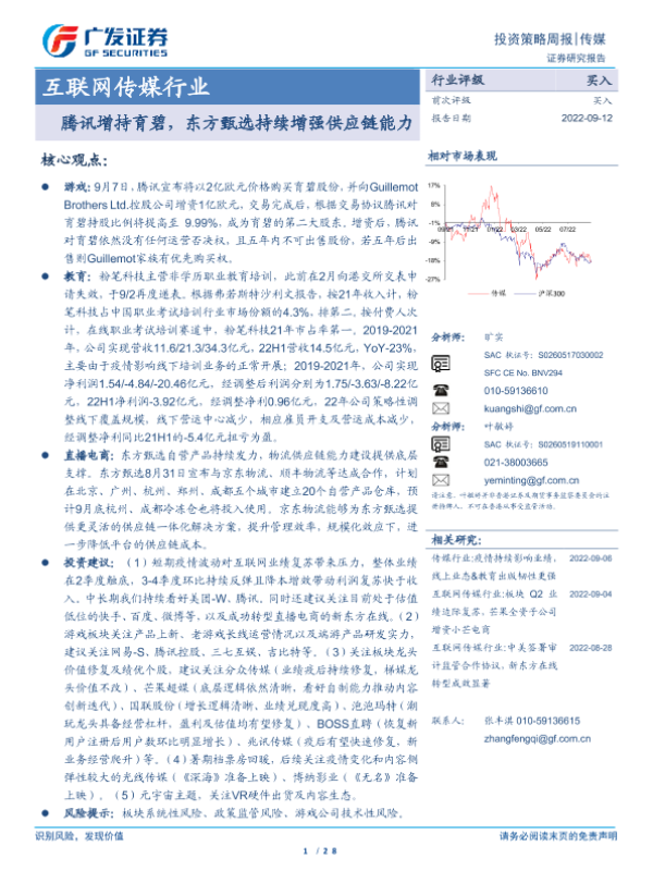 【广发证券】【20220912】互联网传媒行业:腾讯增持育碧,东方甄选持续增强供应链能力-28页 行业研究