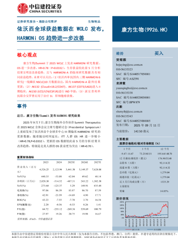 【中信建投证券】【202509】康方生物/Summit于2025 WCLC上发表HARMONi研究数据,OS进一步改善,HR=0.78(P=0.0332),生存获益较此前5月分析结果呈明显改善趋势,且与HARMONi-A的临床研究数据具有相同获益趋势。-10页 证券期货研究报告