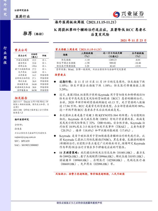 【兴业证券】【20211123】海外医药板块周报:K药获批第四个辅助治疗适应症,显著降低RCC患者术后复发风险-15页 行业研究