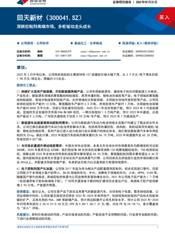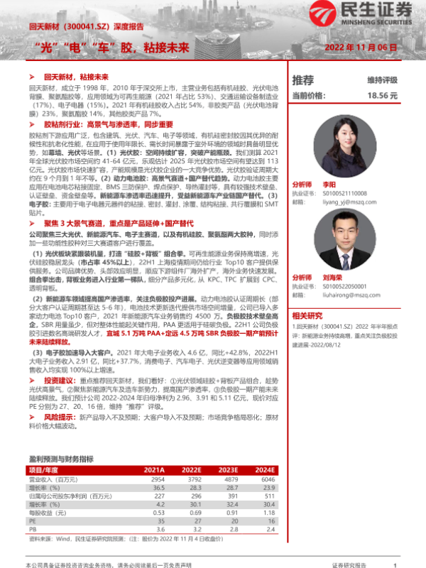 【民生证券】【20221106】回天新材(300041.SZ)深度报告:“光”“电”“车”胶,粘接未来-27页 行业研究