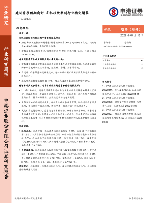 【申港证券】【20220418】20220418-申港证券-石油化工行业研究周报:建筑需求预期向好 有机硅胶粘剂行业稳定增长-19页 行业研究