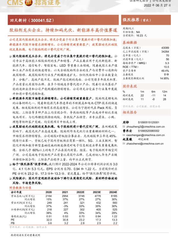 【海通证券】【20220627】回天新材:胶粘剂龙头企业,持续加码光伏、新能源车高价值赛道-21页 公司研究